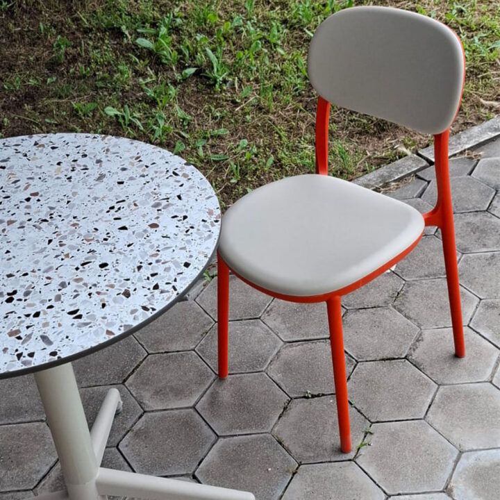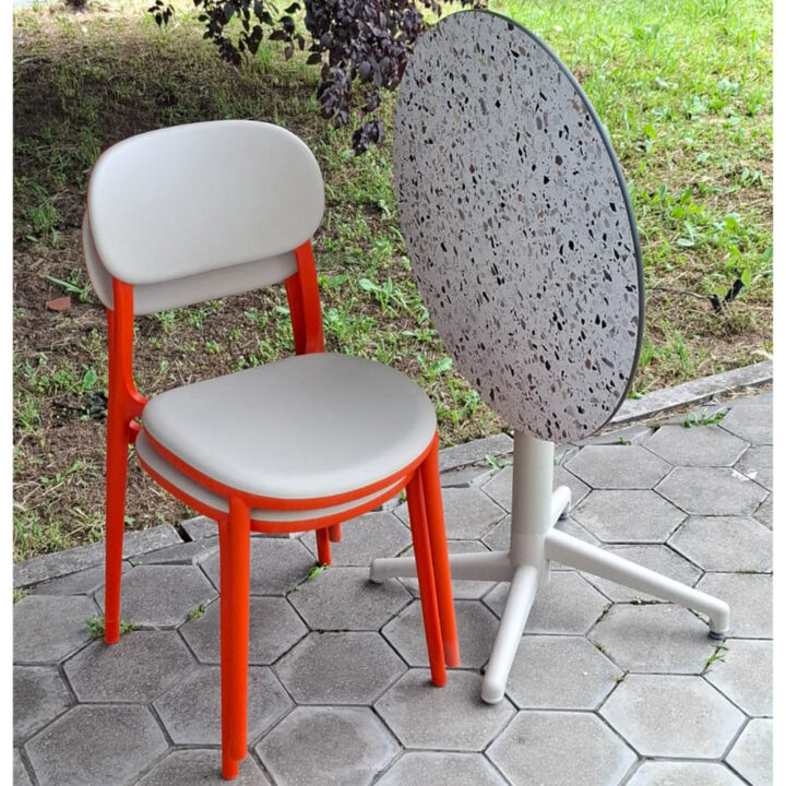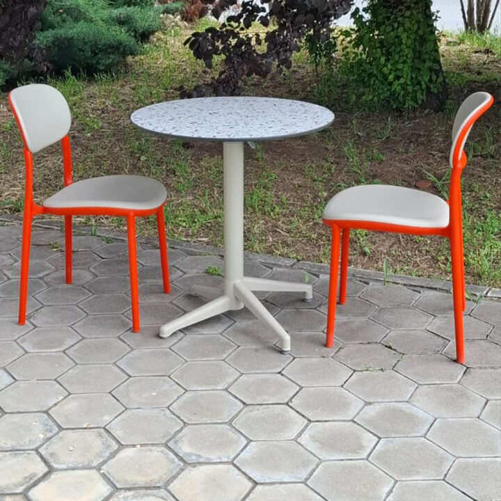 Elegantna garnitura za baštu ili terasu. Okrugli sto Moon (Ø70) sa HPL pločom otporan je na sve vremenske uslove. Stolice Duo od polipropilena, u bež-narandžastoj boji, pružaju udobnost i dugotrajnost. Idealan spoj stila i izdržljivosti.