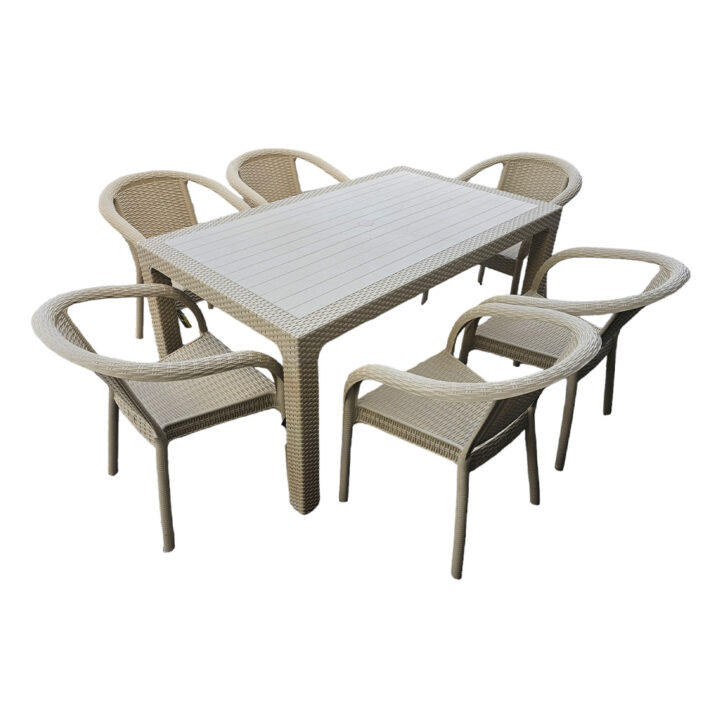 Ova atraktivna Bamboo garnitura sastoji se od sest slozivih stolica i stola dimenzija 90×150 cm, savrsenih za svaki spoljasnji prostor. Izradjena od plastike, garnitura je otporna na vremenske uslove, sto je cini idealnom za terase, dvorista i balkone.