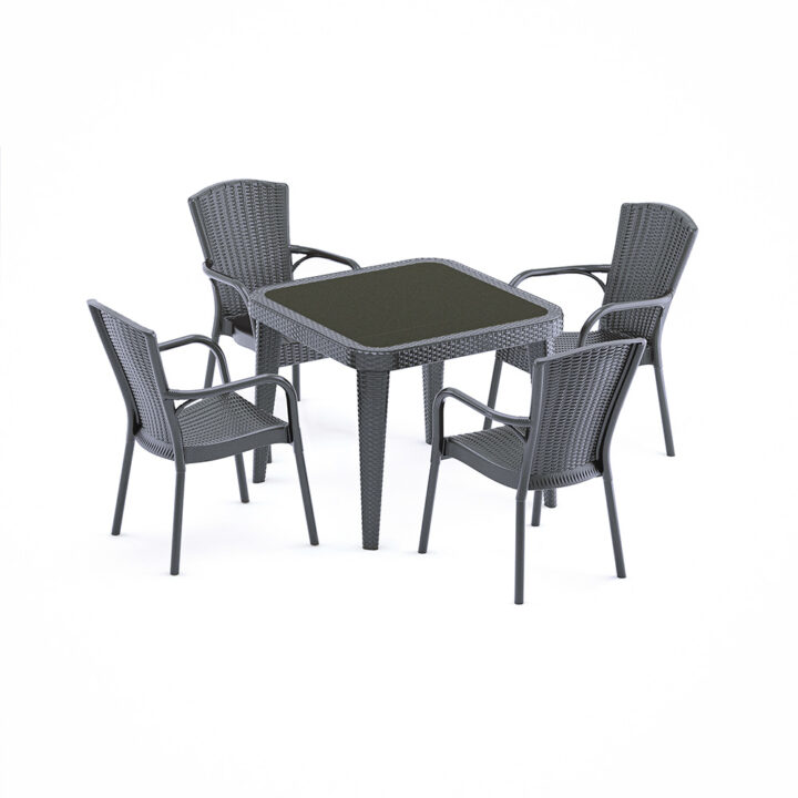 OSAKA sto je savršen izbor za sve spoljašnje prostore, izrađen od polipropilena pokrivenog peskiranim staklom visokog kvaliteta. Ovaj sto se odlikuje teksturom ratana, koja mu daje sofisticiran i elegantan izgled, dok istovremeno osigurava izdržljivost i otpornost na sve vremenske uslove. Plastične stopice na nogarima omogućavaju stabilnost i sprečavaju klizanje, čak i na neravnim površinama.
