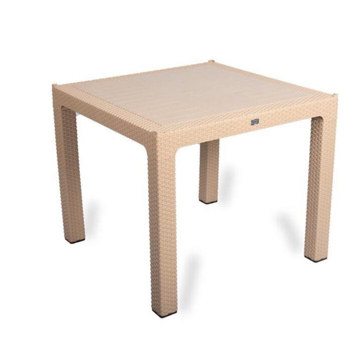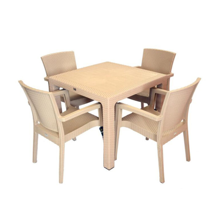 Ova garnitura sastavljena od cetiri Rattan stolice i stola dimenzija 90×90 cm idealna je za svaki spoljasnji prostor. Izradjena od plastike, garnitura je otporna na sve vremenske uslove, sto je cini savrsenim izborom za terase, dvorista ili balkone.