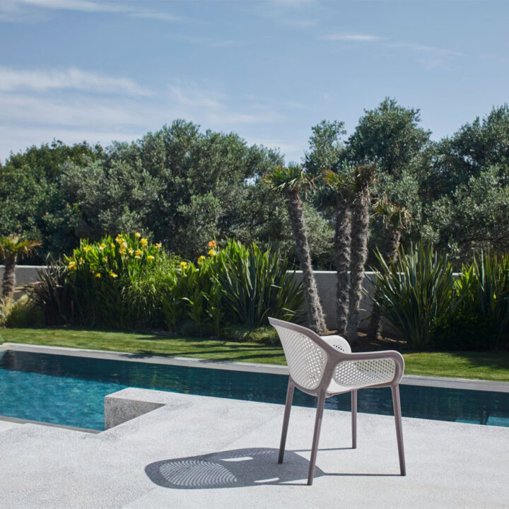 Stolica Atra je izradjena od polipropilena ojaconog staklenim vlaknima. Pogodna je za koriscenje na otvorenom prostoru, otporna na sve vremenske uslove i spoljasnje uticaje. Model je izradjen iz dva dela: sedalnog i nogara, zato je i sama stolica dvobojna. Stolicu je dizajnirao poznati turski dizajner namestaja Kunter Sekercioglu. Zbog svoje prozracnosti model je idealan za bazene i hotelske komplekse. Sloziva je i prakticna za odlaganje.