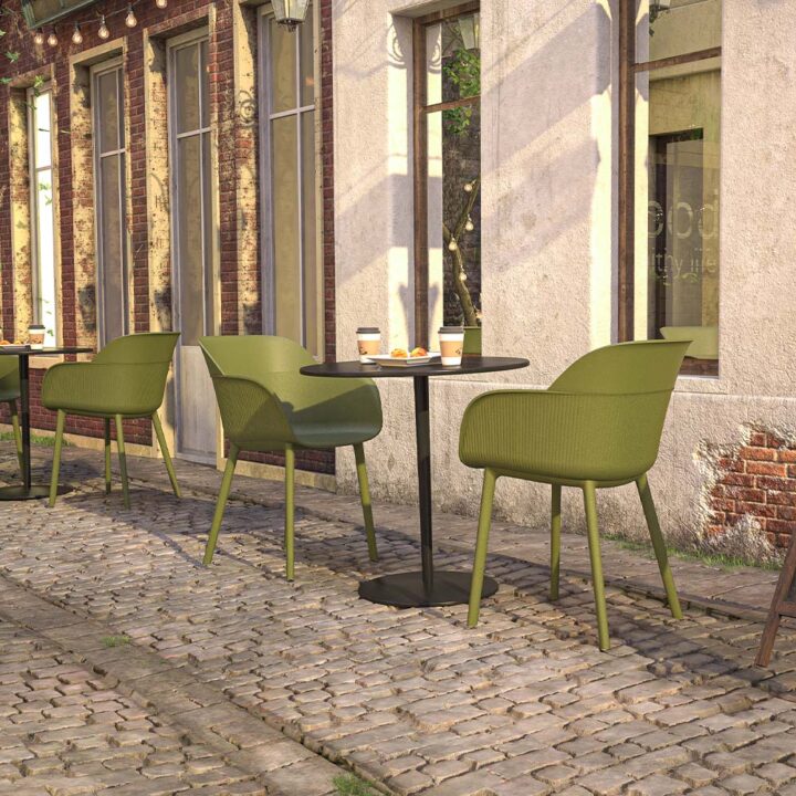 Kvalitetna i popularna stolica modernog dizajna od polipropilena (najkvalitetnije plastike). Pogodna za spoljasnji prostor. Otporna na sve vremenske uslove.