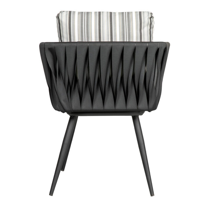 Stolica Taken je moderna i funkcionalna, napravljena od aluminijuma. Na naslonu i rukonaslonu se nalaze pertle koje dodaju stil i eleganciju. Poseduje fabricke jastuke i pogodna je za pokrivene spoljasnje prostore. Boje aluminijuma, jastuka i pertli mogu se birati po zelji. Laka je za odrzavanje.
