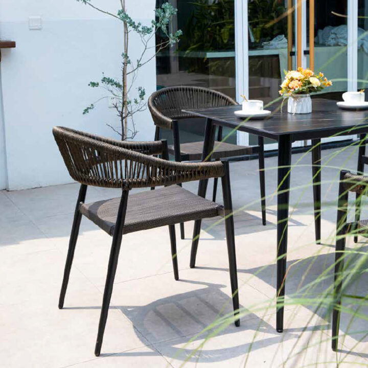 Stolica Teddy ima cvrstu aluminijumsku konstrukciju, dok sedalni deo i naslon mogu biti izradjeni od tekstilena i PE Rattana. Otporna je na sve vremenske uslove, lako se odrzava i pogodna je za spoljasnje prostore, sto je cini idealnim izborom za terase, baste i ugostiteljske objekte.